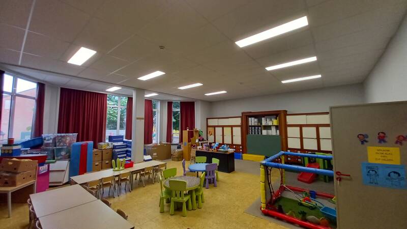 In de kleuterklassen waren de TL-lampen aan vervanging toe. Na vele jaren dienst is de lichtopbrengst niet meer wat ze ooit geweest is.